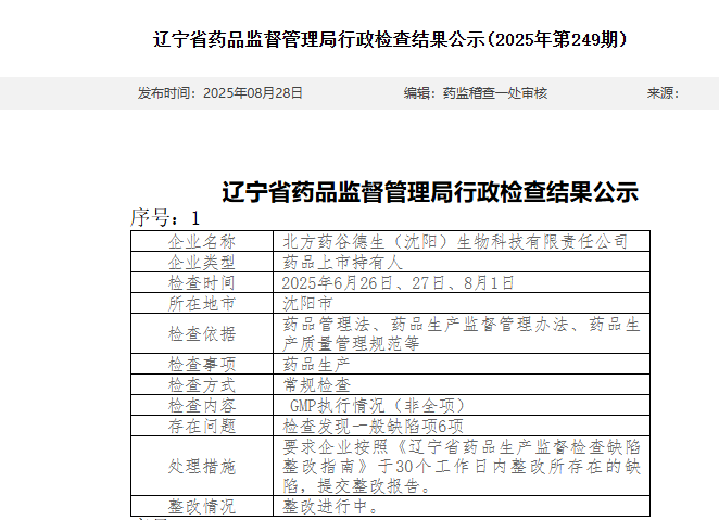 中國經(jīng)濟網(wǎng)9月1日訊 日前,遼寧省藥品監(jiān)督管理局公示多則行政檢查結(jié)果信息。其中,在對北方藥谷德生(沈陽)生物科技有限責(zé)任公司GMP執(zhí)行情況檢查中,發(fā)現(xiàn)該公司存在一般缺陷項6項。對此,遼寧省藥品監(jiān)督管理局要求該公司按照《遼寧省藥品生產(chǎn)監(jiān)督檢查缺陷整改指南》于30個工作日內(nèi)整改所存在的缺陷,提交整改報告。目前,該公司整改進行中。